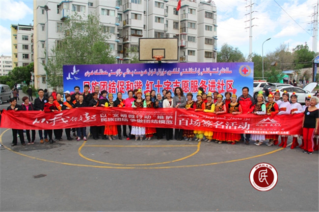 新疆乌鲁木齐市红十字会抗癌志愿者服务队和社区群众带来了精彩的歌舞表演,为实践活动增加了欢庆愉悦的氛围博得各族群众阵阵掌声。