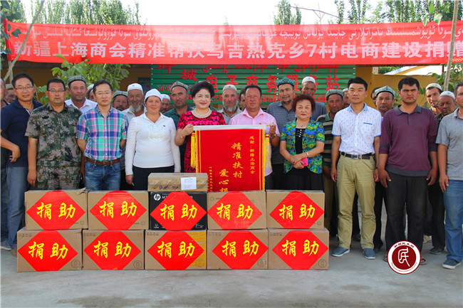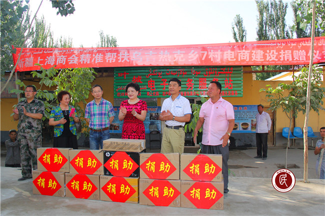 新疆上海商会为该村电商捐赠了5台电脑、1台打印机等设备,并根据当前电商建设情况提供了“金点子”,助力该村建成服务网点体系健全、商务应用范围广泛、支撑服务体系完备、地域资源特色鲜明的电子商务平台,用好用活电商这把“金钥匙”,为群众打开致富门。