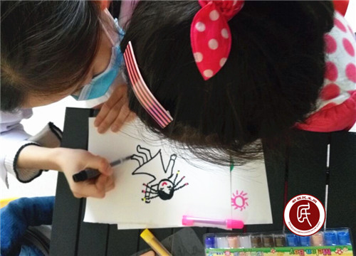 图为新疆医科大学第一附属医院社会工作部的一名志愿者在与孩子们互动绘画。