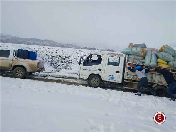 不畏恶劣路况和天气,哈拉峻乡干部、村干部、护边员、边防民警与广大的农牧民群众组成救援小组,自备干粮,带着开通牧道直到打通最后一公里的必胜决心,前往牧区救灾。