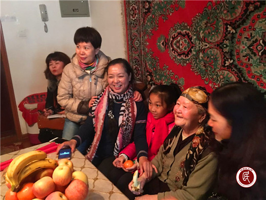 图为阿依孜.木汗大妈(右二)说:多年来,正是我们这些志愿者们时常的牵挂和探望,让自己感觉到有了这么多儿女一样,非常开心。