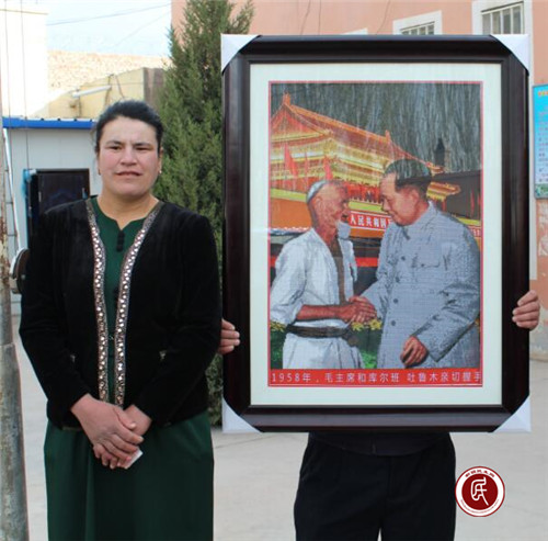 新疆民生网讯 (通讯员 文∕田丽 图∕艾合旦木·艾克拉木)4月3日,升国旗仪式结束后,阿孜汗村贫困户聋哑绣娘吾丽古丽·吐尔逊把她精心制作的十字绣新作——“毛泽东和库尔班·吐鲁木亲切握手”、黄金满地全景图等一一呈现在众人面前。