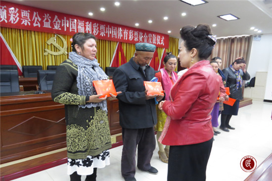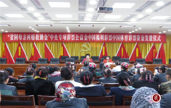 新疆民生网讯(通讯员 李红景)4月18日,阿克陶县“贫困母亲两癌救助金”中央专项彩票公益金“中国福利彩票、中国体育彩票”资金发放仪式在玉麦乡举行,对全县患有乳腺癌、宫颈癌“两癌”的7位贫困母亲各发放补贴治疗费10000元。县妇联主席、玉麦乡妇联主席及各乡(镇、场)妇女主任、妇女小队长共120余人参加仪式。