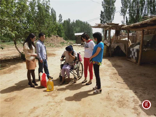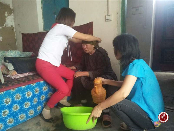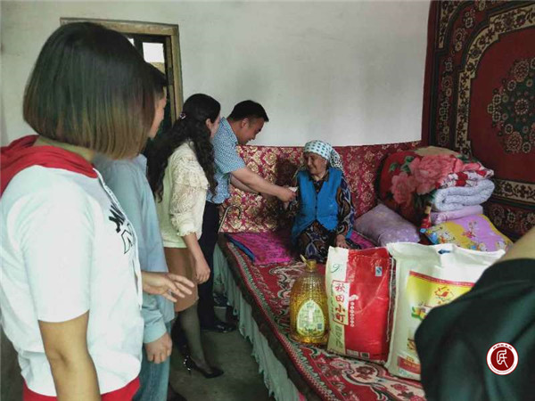 在慰问我乡深度贫困村的贫困母亲艾木拉汗·玉素甫时,妇联主任阿依尼沙亲自了解阿木拉汗带有眼疾十几年,生活不便,不能从事劳动,儿子常年在外打工只有过节才会回来。为了帮助她乐观的面对生活,阿依尼沙汗陪她聊天、洗头、洗衣服帮助她整理家务。并带去米面油等生活上的帮助和五百元的慰问金,她感激道:“感谢党和政府的关心与帮助,虽然我看不见世界的色彩,但有了你们让我看到了生活的色彩。”