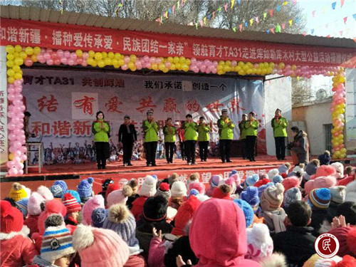 团队的全体成员上台表演集体舞蹈,展示了他们积极向上,不忘初心,继续前进的决心与团队风采。同时,学校也让孩子们精心编排了集体舞蹈,六年级学生鲁吐普拉·买买提的一曲《天亮了》把现场气氛推向了高潮。工作队为了答谢爱心人士的大爱付出,以特有的礼节和习俗,为此次开展公益捐赠活动爱心人士赠送了维吾尔族小花帽,客人们戴着小花帽与当地各族师生,各族群众一起跳起了维吾尔族传统舞蹈《麦西来普》,场面既温馨又以一种方式在传达着一种爱。