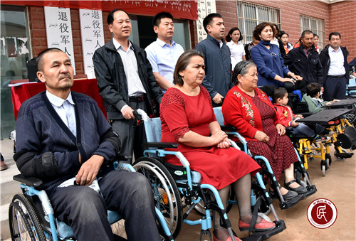 新疆民生网(颜寿林)5月18日,温宿县残疾人联合会工作人员向城乡残疾人发放轮椅、拐棍助行器和补贴。当日,在第二十九次全国助残日来临之际,温宿县举办第二十九次全国助残日庆祝活动,现场向全县城乡残疾人发放轮椅、拐棍助行器等,同时,还发放残疾人评定补助和慰问金,激励广大残疾人继续发扬自强不息、奋发进取的精神,努力改变自己的生活。