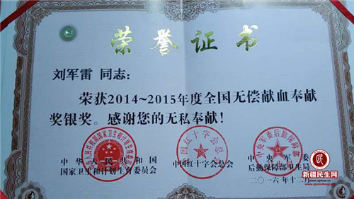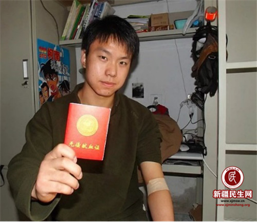新疆民生网(任毓淇)如果不是被同事不小心翻到刘军雷压在便利贴下面的献血证,这位平凡的28岁青年默默捐献10年血液的故事,也许还不会被同事知道。