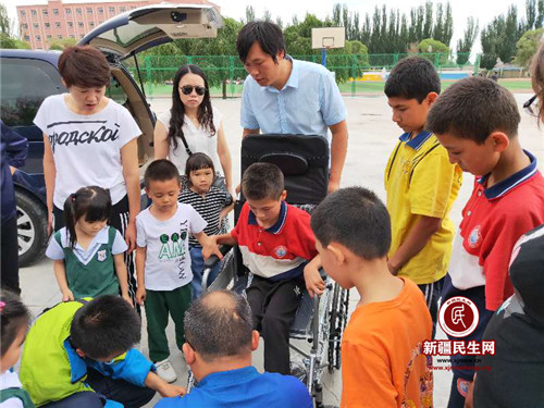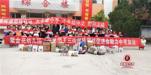 新疆民生网(苗建华、王煜)6月21日下午,阿克苏市新城街道团结社区、“访惠聚”工作队组织辖区紫金花幼儿园及辖区社会爱心人士一行10人来到阿克苏市阿依库勒镇中学开展“大手牵小手·关爱贫困儿童”活动,并看望慰问贫困儿童,为孩子们送去关心、关爱。