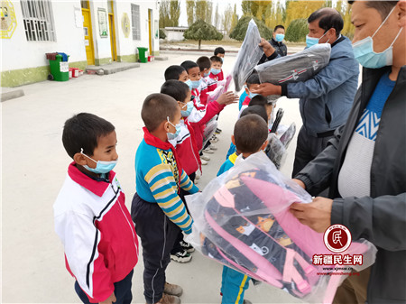 新疆民生网(王丽)10月10日,拜城县人民检察院驻察尔齐镇吾斯塘布依村工作队带着新书包看望村小学学生,为19生活困难学生送去了爱心书包,给新学年的孩子开学礼