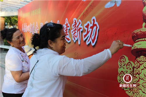 活动现场,由吴师傅带来的抖空竹文艺表演掀起了活动的高潮。台上红歌联唱、舞蹈表演……一个个精彩纷呈的节目不时引来阵阵掌声,活动在众人齐唱《我和我的祖国》歌声中圆满落幕。活动接近尾声时,第九社区居民热西旦和自己的“亲戚”共同在留言版上签字,书写出对党的礼赞。她说,在“亲戚”的帮助下,自己有了稳定的工作,现在孩子的上学费用也减免了很多,老公在社区的帮助下也找到了工作,党的政策好,民族团结一家亲好,我们的生活越来越好。