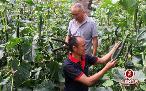 新疆民生网(颜寿林)5月27日,温宿县托甫汗镇新村农民陈英会(前面)在温室里采摘黄瓜,批发给蔬菜收购商。温宿县2016年利用项目资金在托甫汗镇新村占地360亩耕地新建60个现代化智能温室,承包给60户农民用于种植反季节蔬菜,建起蔬菜专业村,做到每个温室一年种两茬反季节蔬菜,加快了农民脱贫致富步伐。