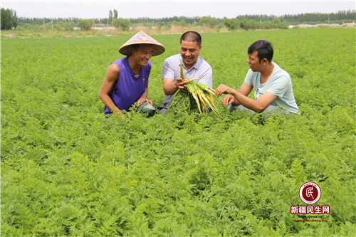 新疆民生网(颜寿林)6月8日,温宿县人民医院驻托甫汗镇新村访惠聚工作队队员(中)同村民交流学习夏季蔬菜黄萝卜后期管理技术知识。今年,该县充分利用本地水土光热资源充足和发挥离县市较近的地缘优势,积极引导农民调整农业产业结构,鼓励农民种植好生育期短、产量高、收入快的夏季蔬菜。目前,这个县已种植夏季蔬菜1.17万亩,由于广大农民加大物化投入,科学管理,全县夏季蔬菜黄萝卜、西红柿、茄子、辣椒等11种蔬菜长势喜人,已全面进入结果成熟期,第一茬夏季陆地蔬菜黄萝卜可望在6月下旬上市。
