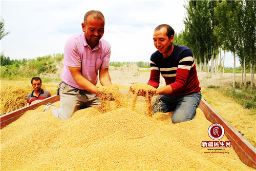 新疆民生网(颜寿林)7月1日,温宿县阿热勒镇吾斯坦布衣村农民尼亚孜·毛尼亚孜(左一)和家人手捧着金灿灿的丰收麦子喜上眉梢。今年该县扩大优质小麦种植面积,注重选用品质优、产量高、抗病性强的小麦为主栽品种,积极推广普及小麦高产栽培技术。据农业部门实地测产,今年全县种植的22·4万亩小麦平均单产达452·35公斤,总产单产再创历史新高。