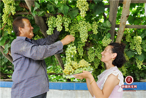 新疆民生网(颜寿林)8月19日,温宿县托甫汗镇尤喀克托甫汗村农民吐尔洪·吾斯曼在庭院里采摘鲜食马奶子葡萄,准备拿到市场上出售。近年来,温宿县大力发展葡萄产业,积极鼓励农民种植早中晚熟马奶子、无核白、红提、玫瑰香、木纳格等七大优质品种葡萄,使全县优质葡萄面积发展到5000余亩,亩均收入在4000元以上。