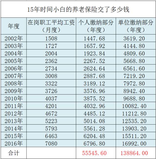 实际上,2002-2016年小白自己一共交了55545.60元,单位交了138864.00元,二者相加接近20万。