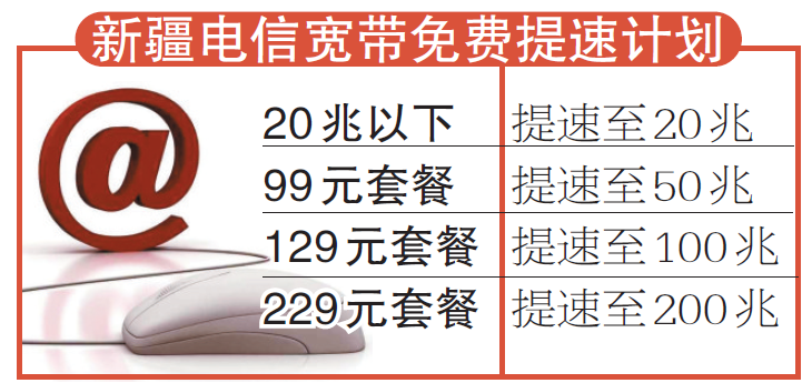 今年6月底前,新疆电信要将20兆以下的宽带用户,免费提速至20兆。使用99元套餐的宽带用户提速至50兆,使用129元套餐的用户提速至100兆,使用229元套餐的用户提速至200兆,共计完成150万宽带用户的免费提速。
