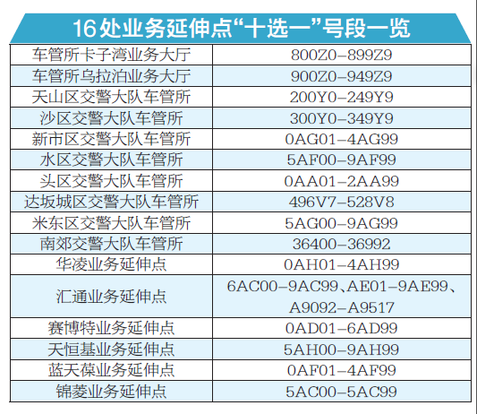 新疆网讯(记者彭芳 通讯员王洪超 孟文武)想要全数字号牌或字母加数字号牌,又想碰运气“十选一”,那么在您满意的号段里选号,好运气也会离您更近些。16日,乌市公安局交警支队车辆管理所公布了目前全市16处“十选一”号牌业务延伸点(见下表)。