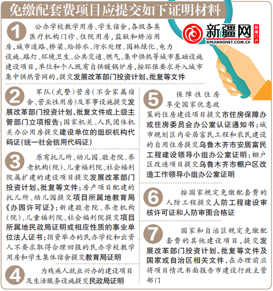 新疆网讯(记者王璇 宋建华 郭军鸽)本月起,乌鲁木齐开始简化免缴城市市政公用基础设施配套费审批程序,免缴配套费的项目提交齐全的7类免缴证明材料,各建设行政主管部门10个工作日内办结审批手续。