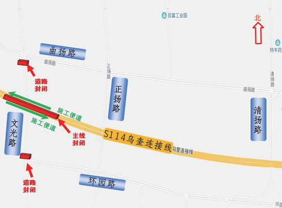 S114线改扩建工程文光路(环园路至曲扬路之间路段)施工围蔽期间,请广大市民根据道路交通通告提前规划自己的出行路线,自觉遵守交通法规,文明出行,服从现场民警和管理人员的指挥。