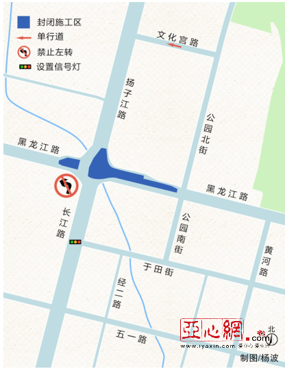 施工期间,黑龙江路沿线公园北街以西50米至扬子江路之间路段,将封闭道路中央4条车道,通过新修、重新渠划,北侧1条车道为车辆由东向北右转专用车道;南侧3条车道分别为:1条西向东方向车道和2条东向西方向车道(一条直行车道,一条左转车道),施工区域南北两侧均保留人行通道。黑龙江路和扬子江路路口,围挡占据东半幅道路,车道整体向西偏移,路口中间预留人行通道及双向六车道,供行人、车流通过。