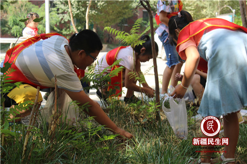 新疆民生网(南淼) 为加强辖区学生管理,丰富暑期社会实践生活,提升学生爱护环境卫生的社会责任感。7月27日,米东区税务局驻米东南路片区管委会同心社区工作队联合同心社区开展“爱护环境卫生,争做环保小能手”欢乐暑期系列活动,组织辖区50余名中小学生清扫社区街道、林带、广场上的杂物。