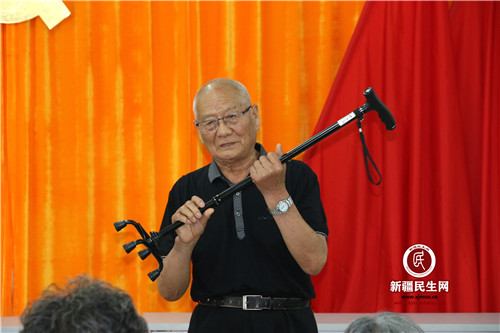 这是发生在7月29日克拉玛依市教育局驻西月潭社区“访惠聚”工作队举办“爱老敬老”爱心拐杖发放仪式上的感人一幕。