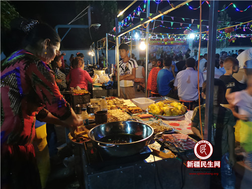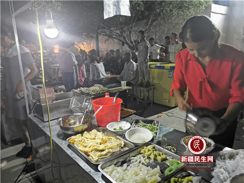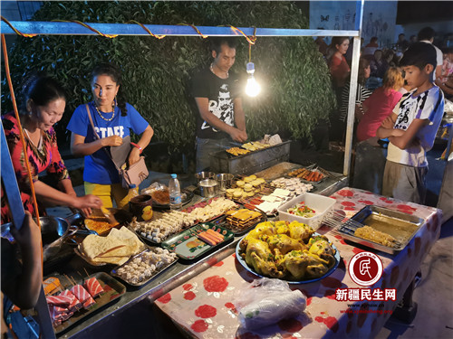 新疆民生网(田萍、丁先斌)8月8日晚九点,暮色降临,华灯初上,布隆乡牙斯热木英阿依玛克村幸福夜市内人头攒动,摆摊的村民架起烤肉炉、烧烤炉,升起袅袅炊烟,摆出提前做好的椒麻鸡、南瓜包子、馄饨、面肺子、凉皮、黄面、煮包谷等琳琅满目的特色小吃,让人垂涎三尺。今天是牙斯热木英阿依玛克村幸福夜市开业的日子。