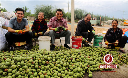 新疆民生网(颜寿林)9月7日,温宿县电信公司驻托甫汗镇新村“访惠聚”工作队队员(左一三)帮助缺劳力村民祁成祥采摘、剥皮、晾晒核桃,争取能卖个好价钱。连日来,工作队始终把群众关心、迫切需要解决的问题作为工作出发点和落脚点,积极帮助孤寡老人、困难户打扫卫生、整治庭院、菜地除草、抢收核桃,解决村民生产生活中实际困难,成为建设美丽乡村、助力精准脱贫的生力军。